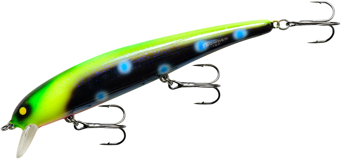 | Bomber Long A B14A | 3 1/2 in | 3/8 oz | 2x #6 | Crank: 2 ft, Troll: 5 ft | Jerkbait for Largemouth, Smallmouth, Striper, Trolling and Crankbait for Walleye, Pike. |