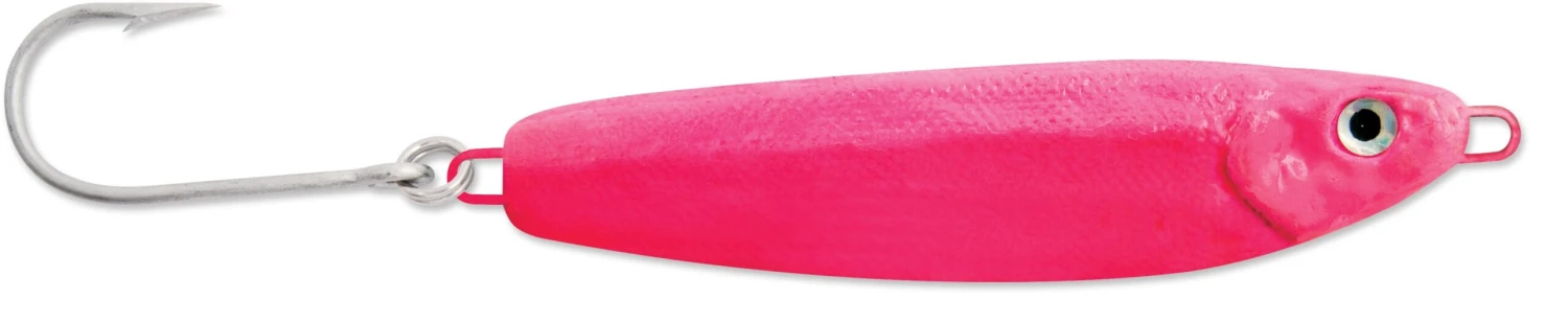 In combination with a fish finder, the lure can be targeted precisely in vertical jigging applications. Fish the Crippled Herring vertically, with a slow, long upward motion of the rod tip followed by a fast drop of the tip. The lure will most often be taken on the downward fall. Pay attention for taps and hesitations on the fall and set the hook when they happen. In cold water conditions, pause at the bottom of the drop for up to three seconds to connect with lethargic fish. In addition to the pre-rigged inline single, the 1/2 ounce through 1-1/2 ounce sizes include an optional VMC treble hook. While the 2 ounce and up sizes include an option siwash hook.