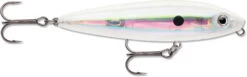 The Rapala Skitter Walk 08 Topwater is a topwater walker. The Skitter Walk 08’s superior construction assures a perfect swimming bait right-out-of-the-box. Toss it out. Pump. Reel. Pump. Reel. You’re “Walking-the-Dog”. Weighted tail keeps bait in natural position even at rest. Large internal rattles create a rhythmic side-to-side motion-and-sound combination that imitates wounded or fleeing baitfish. All feature 3D holographic eyes and you can choose from appetizing painted or chrome color patterns. All are equipped with VMC® black nickel treble hooks. Available in more than 20 different colors.