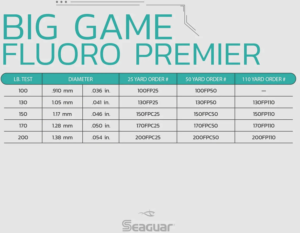 Developed with Seaguar’s exclusive, proprietary Double Structure Technology, Seaguar Fluoro Premier Leader is premium saltwater fishing leader material that represents the current zenith of fluorocarbon leader innovation. Specifically, Fluoro Premier has much smaller diameters and increased strength when compared to Seaguar’s Blue Label and Red Label leaders and is the expert salt anglers choice when they want an unbeatable presentation in terms of both stealth and strength.